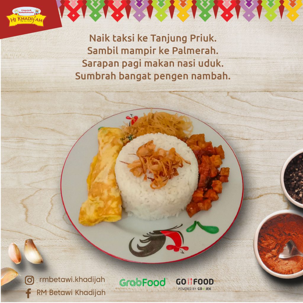 Sedia masakan khas betawi: soto betawi, sop iga, nasi uduk, semur jengkol, sayur asem, pecak ikan, dll.